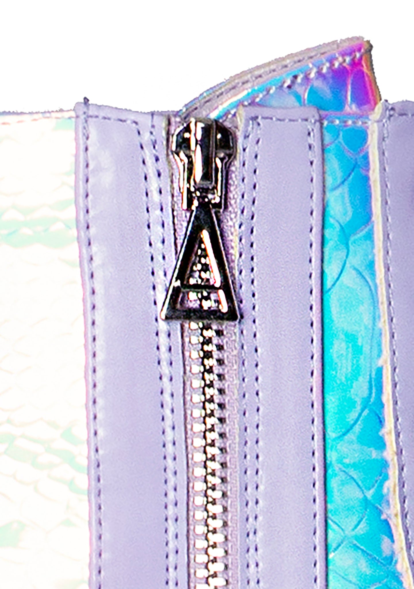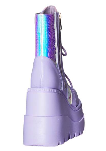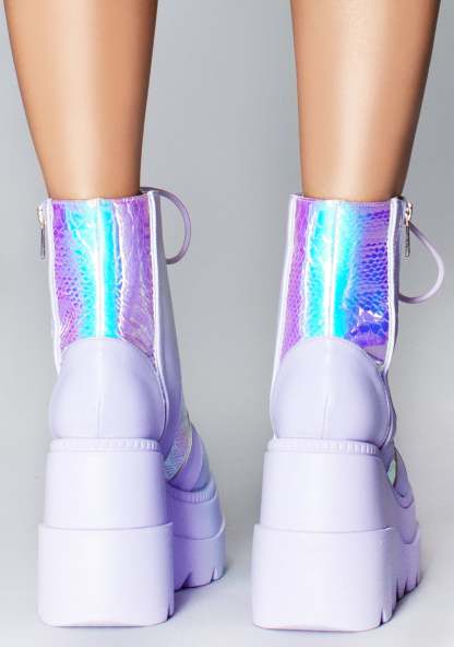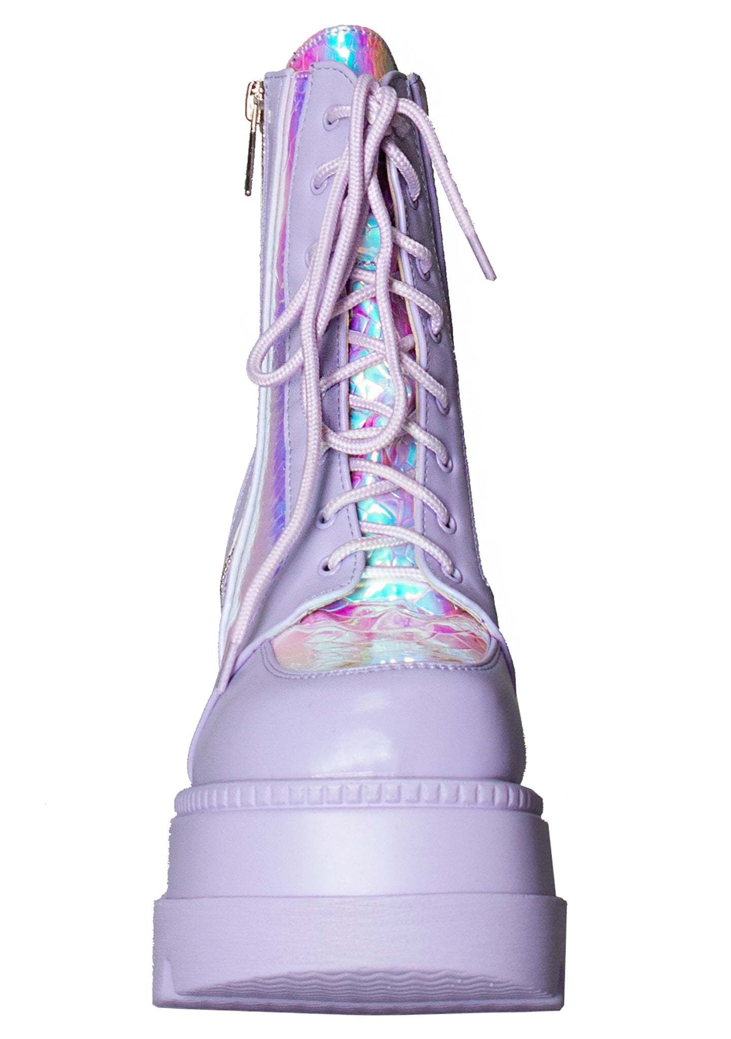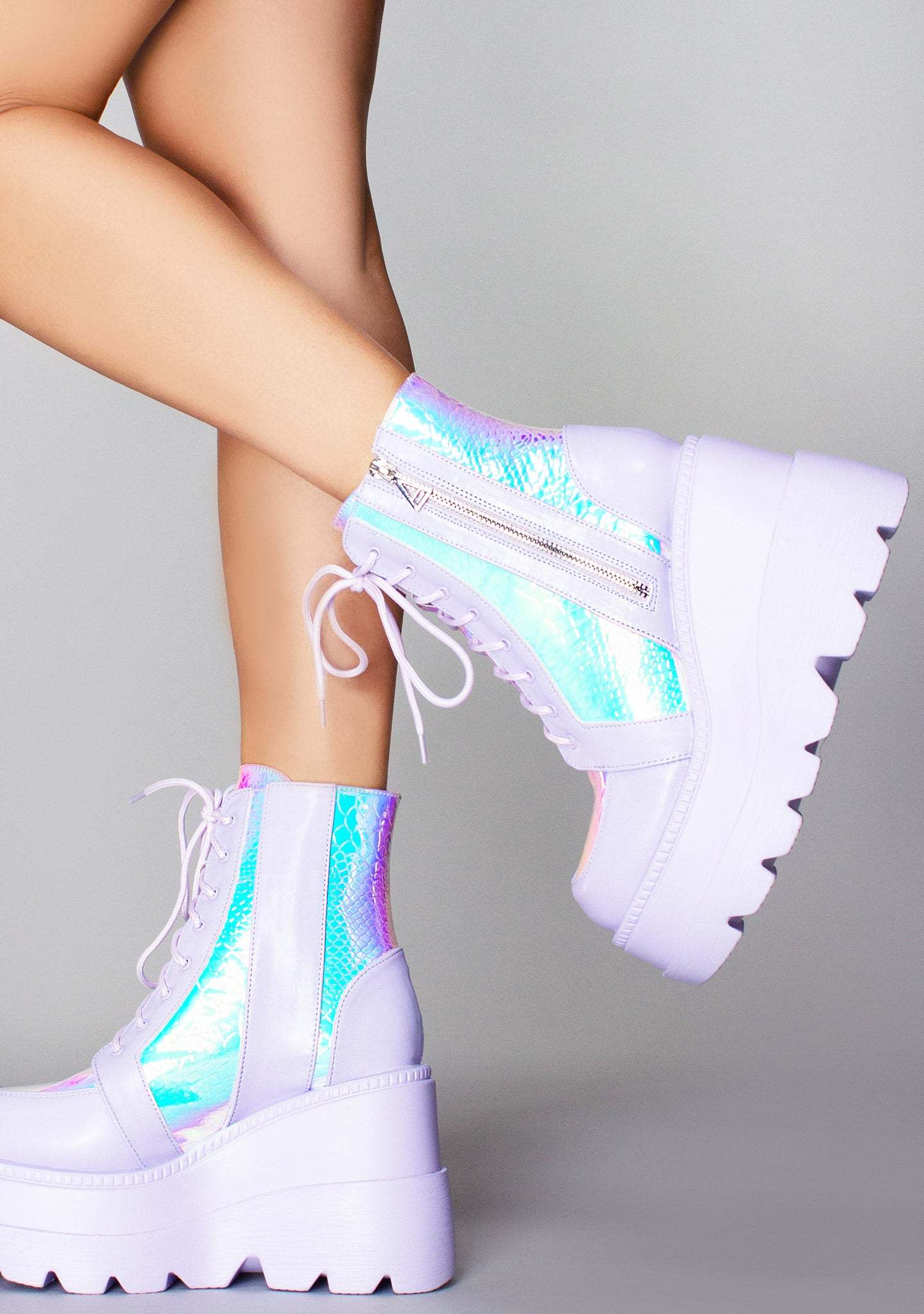 Have power over them all with the Fairy Kiss Platform Boots from LASR! These festival-ready ankle rise rave boots feature a lavender vegan leather upper with iridescent python texture contrast detail, lace-up front, interior zipper closure with logo zipper pull for easy slip-on, logo embroidered tongue, and super lightweight chunky platform sole. With these cute boots, no one will be able to break from your spell.