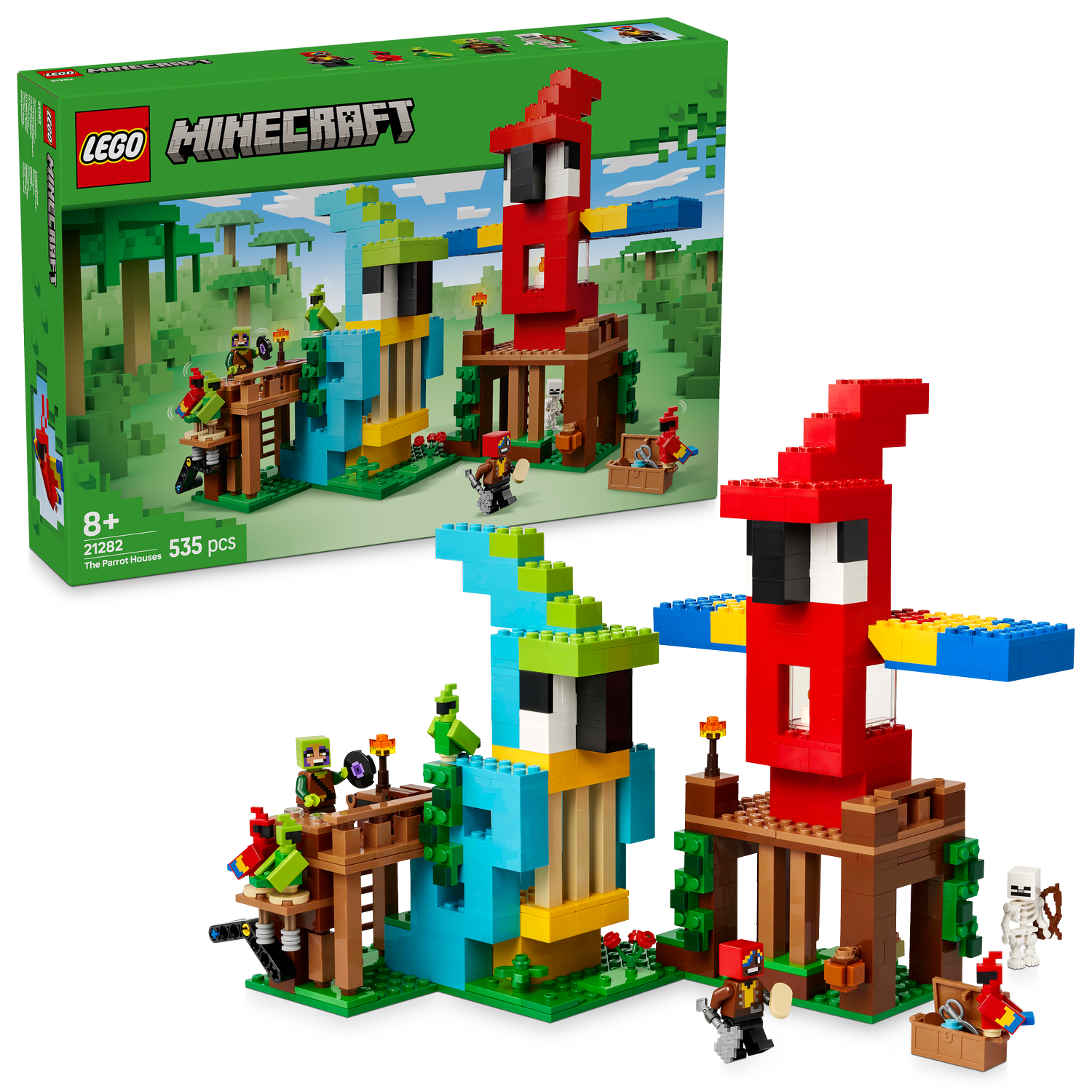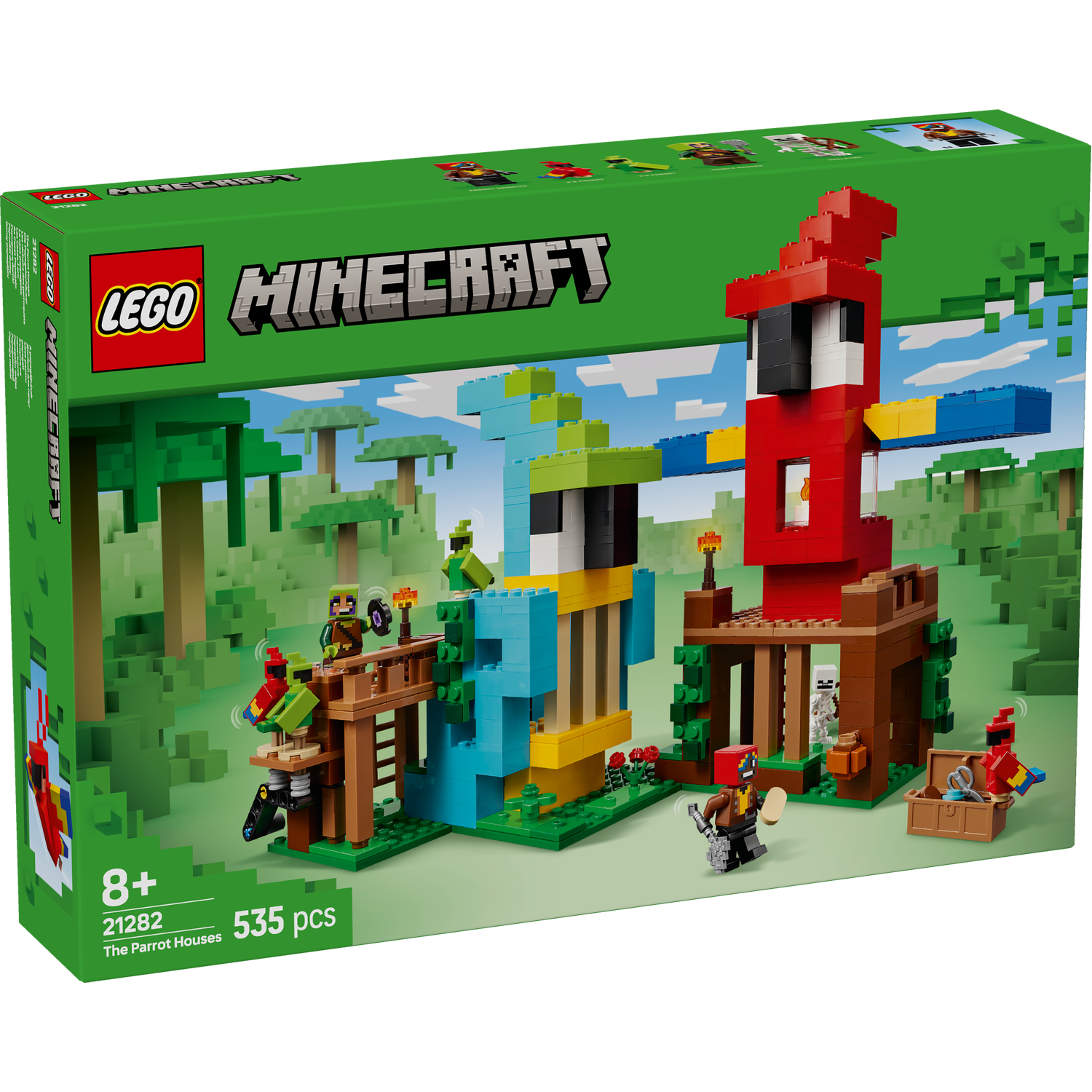 - Minethtcraft® toy figures – This jungle building set includes Jungle Ranger and Parrot Handler minifigures, plus 2 red parrots, 2 green parrots and a skeleton