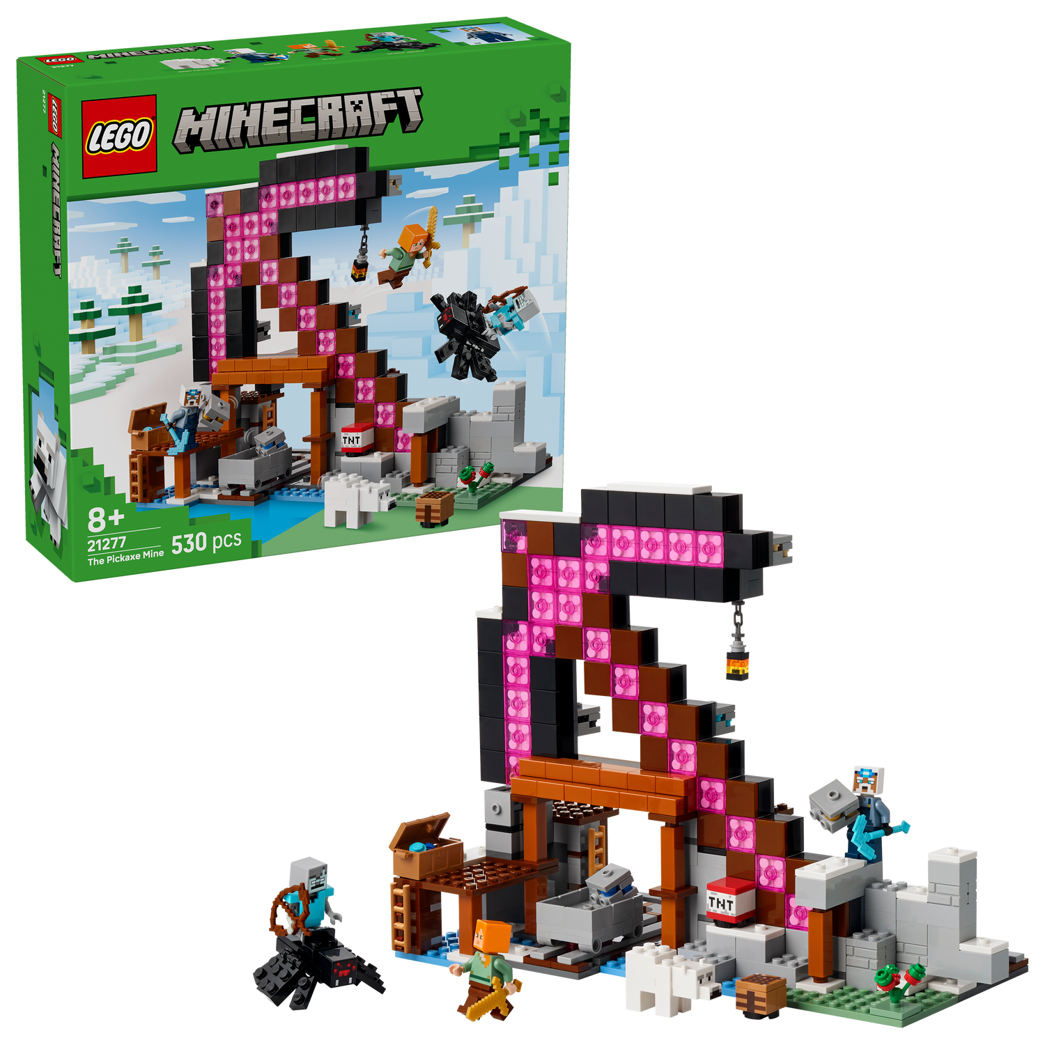 - LEthtGO® Minethtcraft® collectible figures – The set includes Alex, Miner and stray spider jockey minifigures, plus a ridable spider and a polar bear figure