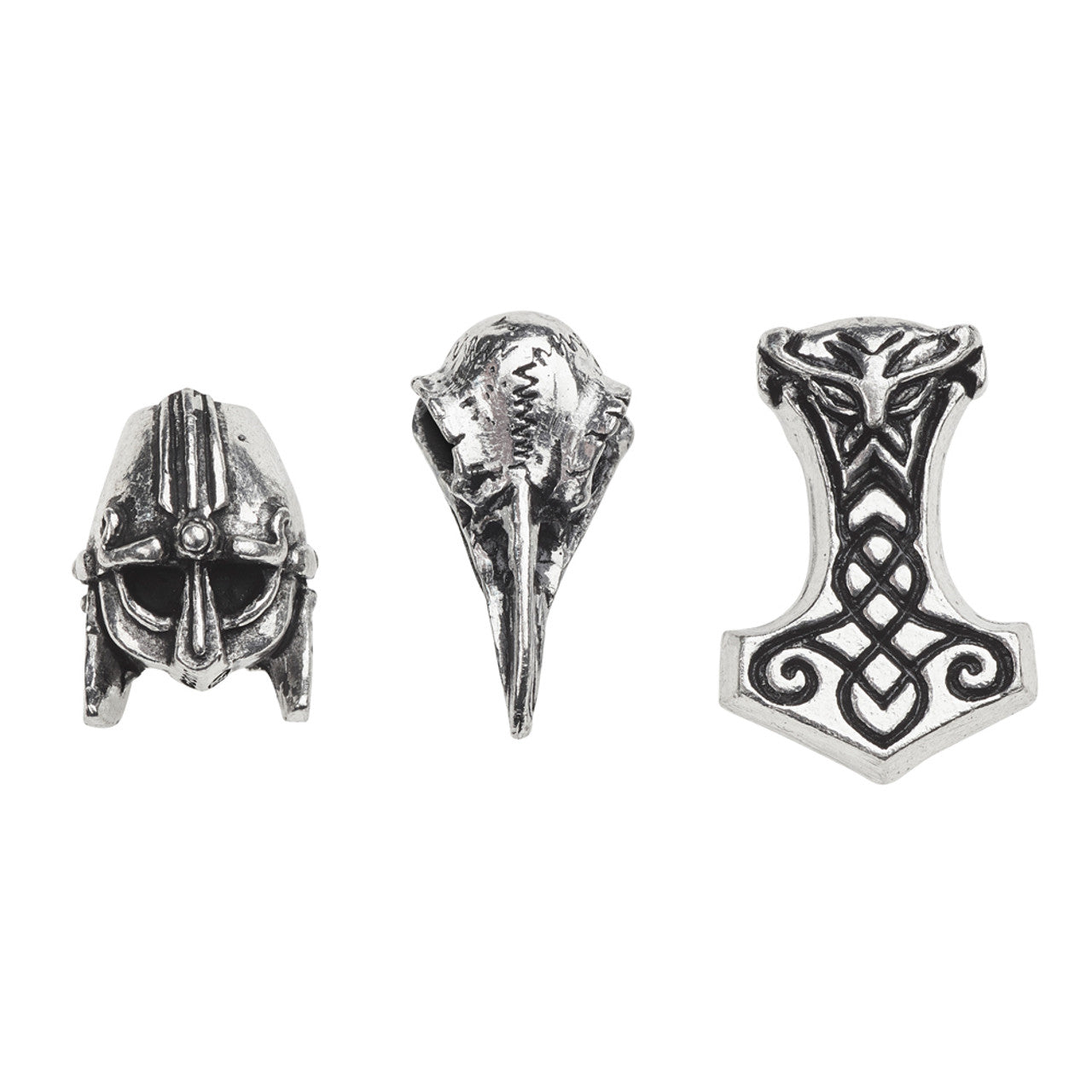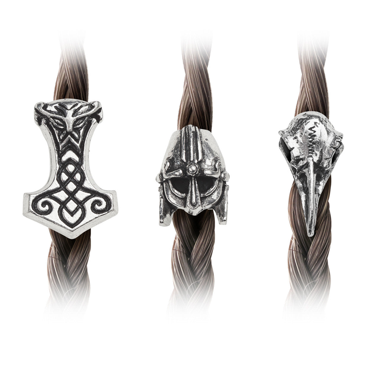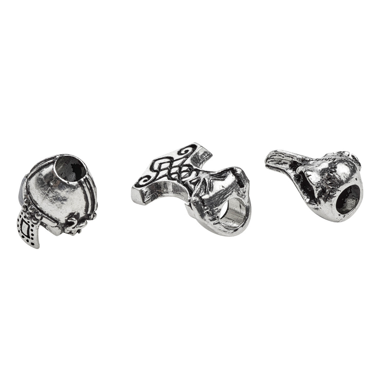 Set of 3 Norsebraid Hair Beads by Alchemy Gothic. These three hair beads, suitable for head hair or beard wear, boast a Norse Viking warrior aesthetic: Mjolnir Thor's hammer, an Odin raven's skull, and a warlord's helmet. Fierce and unapologetic, these hair accessories are sure to attract attention! Designed and handmade in England exclusively by Alchemy Gothic, made of lead-free fine English pewter.